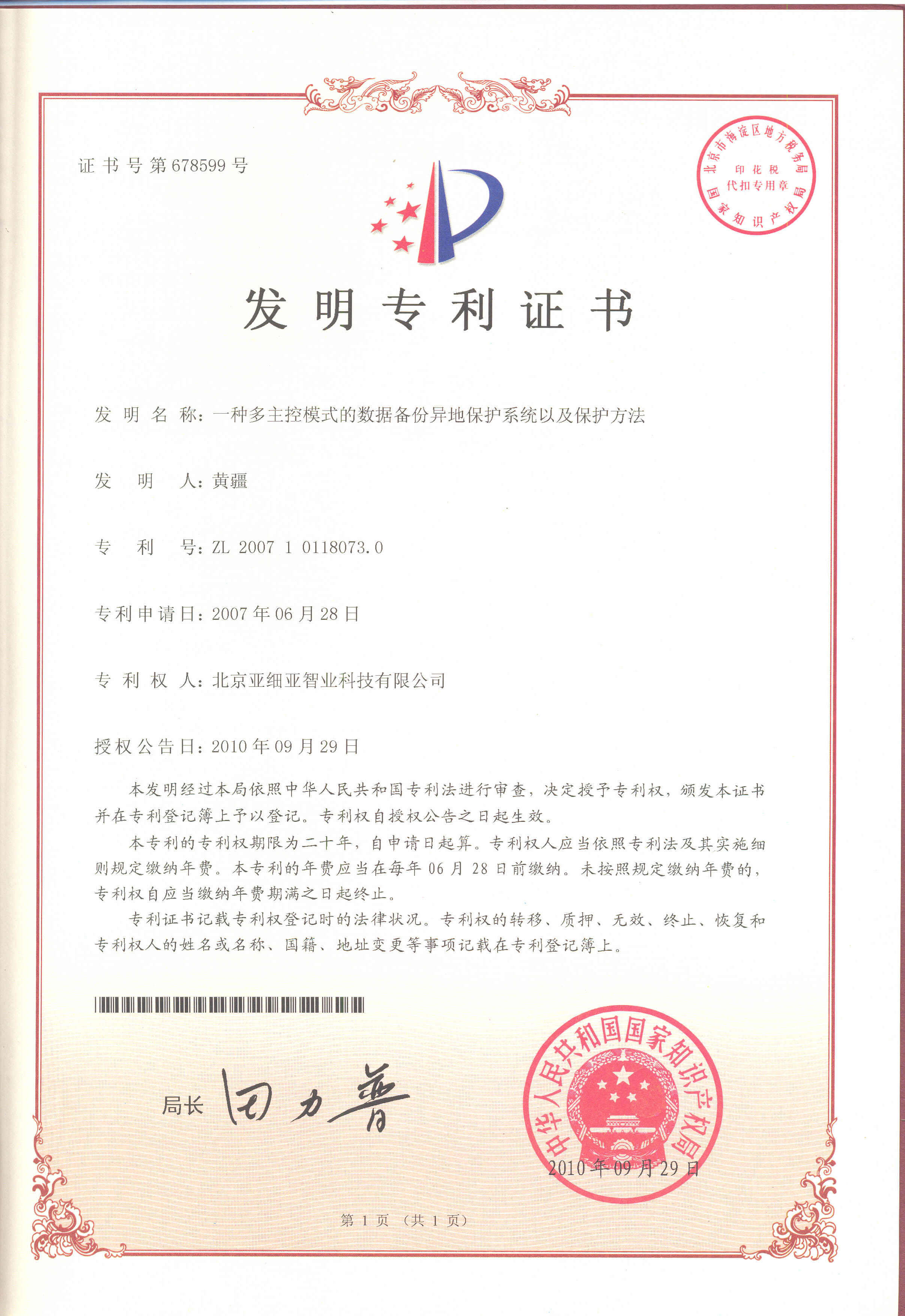 專利證書(一種多控模式的數(shù)據(jù)備份異地保護(hù)系統(tǒng))